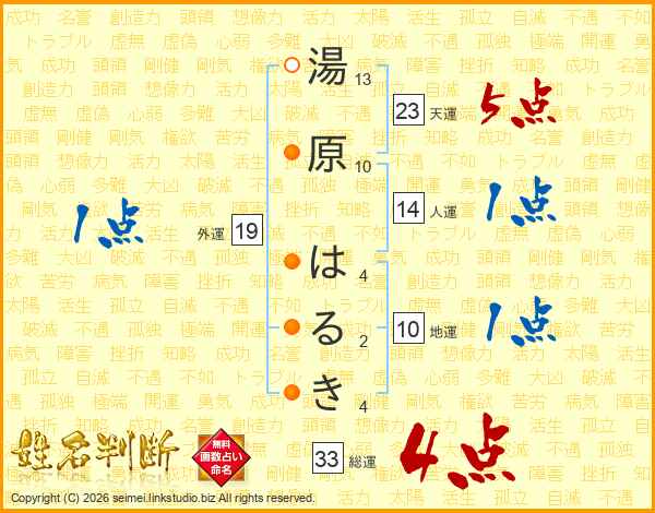 湯原はるきさんの総運は33画の4点!
