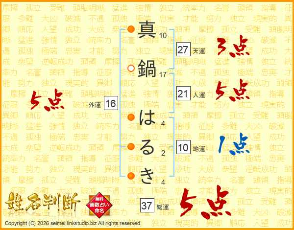 真鍋はるきさんの総運は37画の5点!