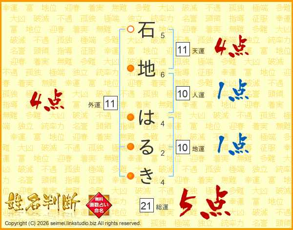 石地はるきさんの総運は21画の5点!