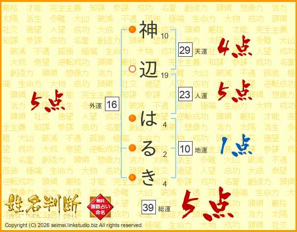 神辺はるきさんの総運は39画の5点!