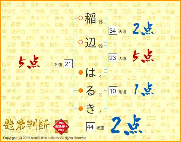 稲辺はるきさんの総運は44画の2点!