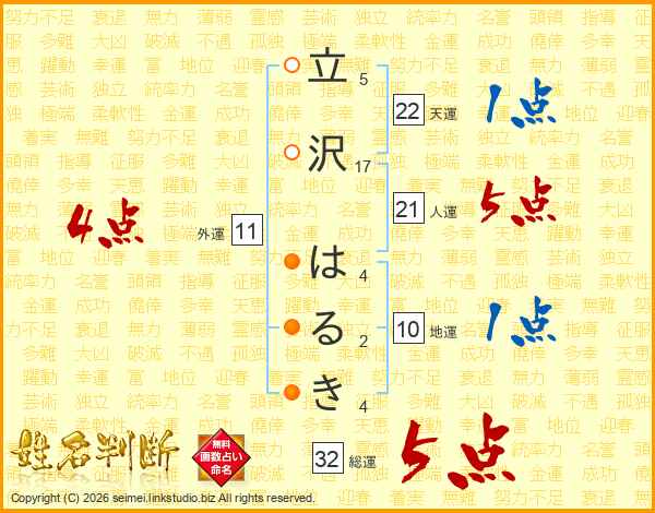 生活面を象徴する運勢です。外部から受ける影響力を表し、結婚運、家庭運や職場、環境への順応性を表します。総運から人運を引いた画数。姓や名が1文字の場合を除く。