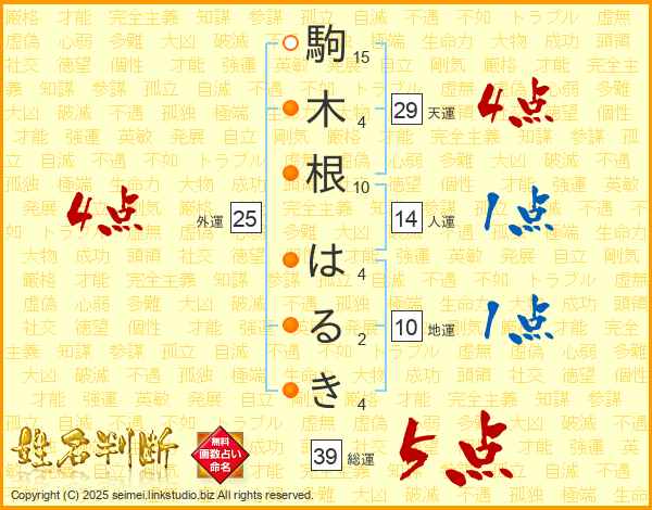 駒(15画)木(4画)根(10画) は(4画)る(2画)き(4画)