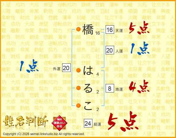 あなたの人生を表す1番重要な運勢です。生涯を通じて影響する総合運となり、主に50歳以降の晩年期に影響を及ぼします。苗字と名前の合計画数。