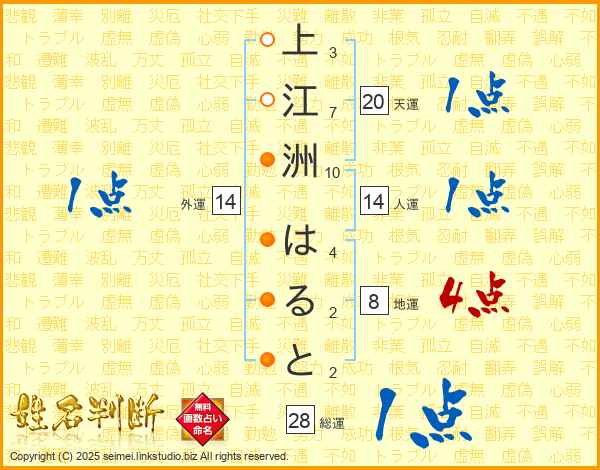 生活面を象徴する運勢です。外部から受ける影響力を表し、結婚運、家庭運や職場、環境への順応性を表します。総運から人運を引いた画数。姓や名が1文字の場合を除く。