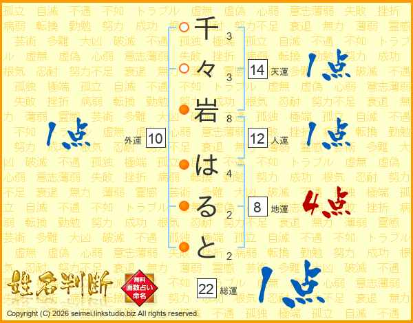 千(3画)々(3画)岩(8画) は(4画)る(2画)と(2画)