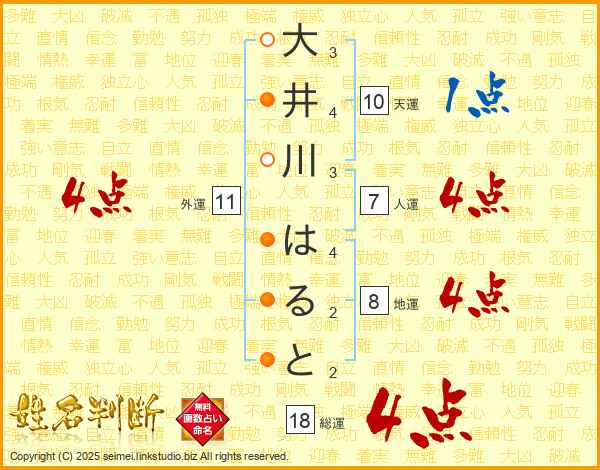 生活面を象徴する運勢です。外部から受ける影響力を表し、結婚運、家庭運や職場、環境への順応性を表します。総運から人運を引いた画数。姓や名が1文字の場合を除く。