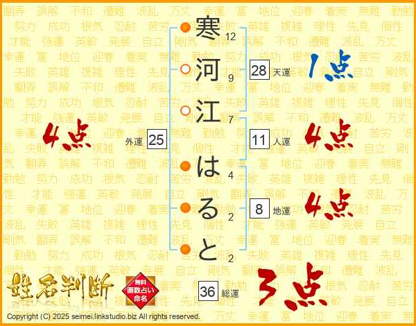 生活面を象徴する運勢です。外部から受ける影響力を表し、結婚運、家庭運や職場、環境への順応性を表します。総運から人運を引いた画数。姓や名が1文字の場合を除く。
