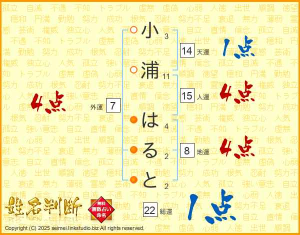 小浦はるとさんの総運は22画の1点!