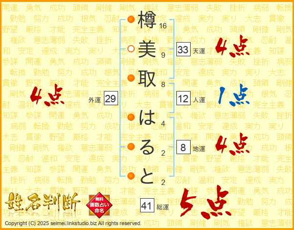 生活面を象徴する運勢です。外部から受ける影響力を表し、結婚運、家庭運や職場、環境への順応性を表します。総運から人運を引いた画数。姓や名が1文字の場合を除く。