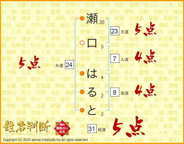 生活面を象徴する運勢です。外部から受ける影響力を表し、結婚運、家庭運や職場、環境への順応性を表します。総運から人運を引いた画数。姓や名が1文字の場合を除く。