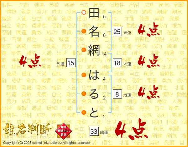 田(5画)名(6画)網(14画) は(4画)る(2画)と(2画)