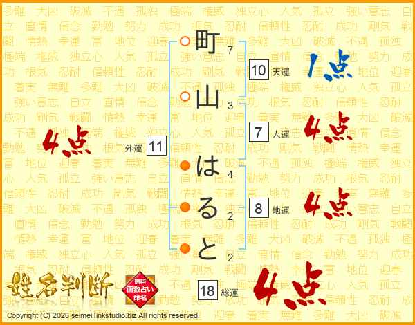 生活面を象徴する運勢です。外部から受ける影響力を表し、結婚運、家庭運や職場、環境への順応性を表します。総運から人運を引いた画数。姓や名が1文字の場合を除く。