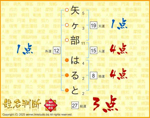 生活面を象徴する運勢です。外部から受ける影響力を表し、結婚運、家庭運や職場、環境への順応性を表します。総運から人運を引いた画数。姓や名が1文字の場合を除く。