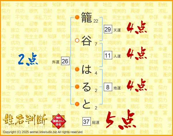 籠(22画)谷(7画) は(4画)る(2画)と(2画)