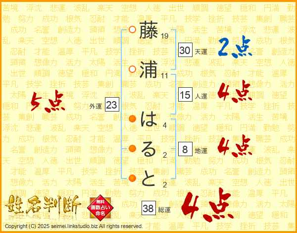 藤(19画)浦(11画) は(4画)る(2画)と(2画)