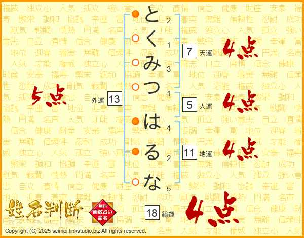 生活面を象徴する運勢です。外部から受ける影響力を表し、結婚運、家庭運や職場、環境への順応性を表します。総運から人運を引いた画数。姓や名が1文字の場合を除く。