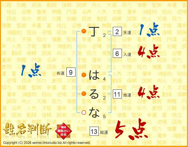 丁はるなさんの総運は13画の5点!