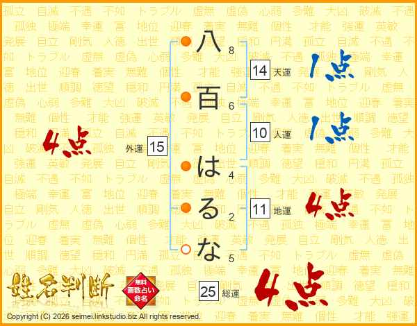 八百はるなさんの総運は25画の4点!