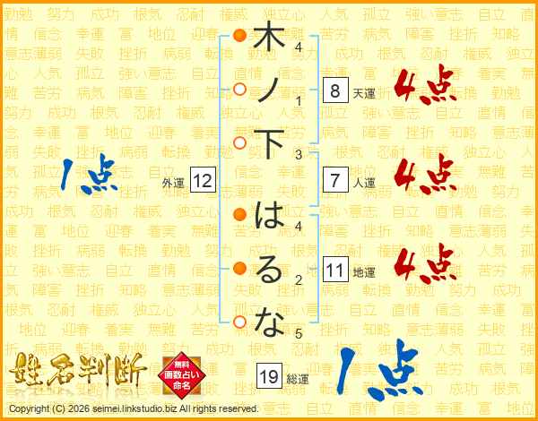 木(4画)ノ(1画)下(3画) は(4画)る(2画)な(5画)