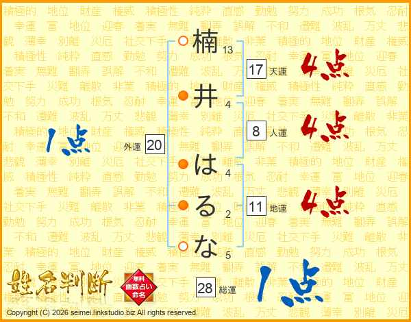 楠(13画)井(4画) は(4画)る(2画)な(5画)