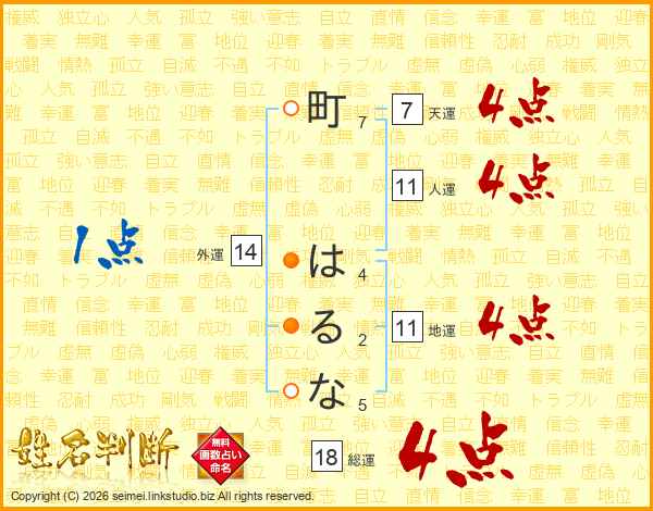 生活面を象徴する運勢です。外部から受ける影響力を表し、結婚運、家庭運や職場、環境への順応性を表します。総運から人運を引いた画数。姓や名が1文字の場合を除く。