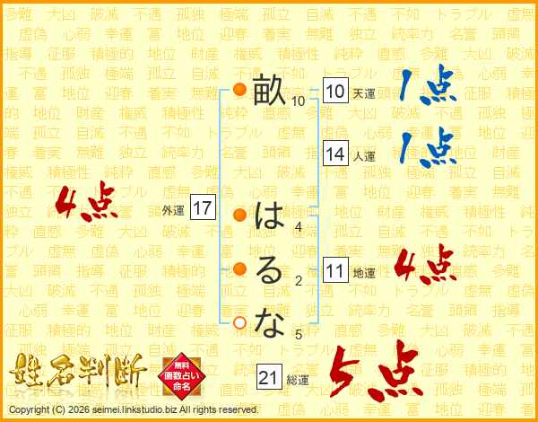 畝はるなさんの総運は21画の5点!