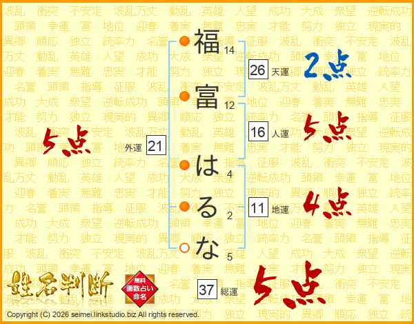 福(14画)富(12画) は(4画)る(2画)な(5画)