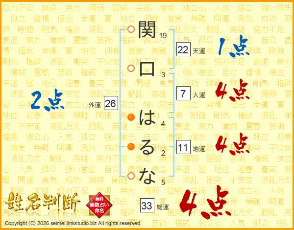 生活面を象徴する運勢です。外部から受ける影響力を表し、結婚運、家庭運や職場、環境への順応性を表します。総運から人運を引いた画数。姓や名が1文字の場合を除く。