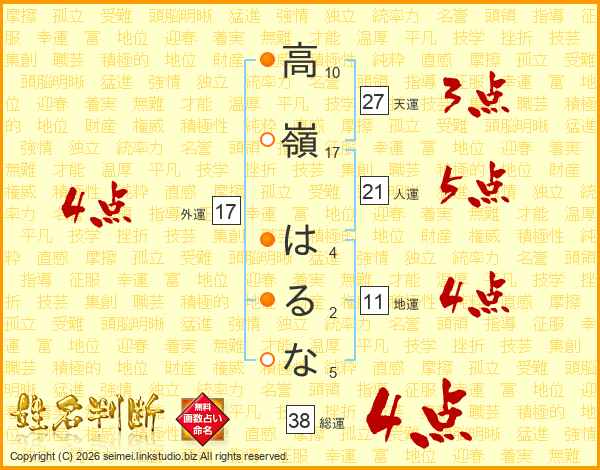 高(10画)嶺(17画) は(4画)る(2画)な(5画)