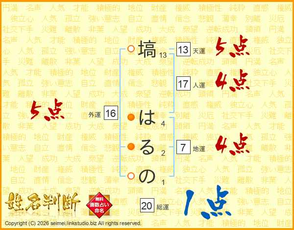 生活面を象徴する運勢です。外部から受ける影響力を表し、結婚運、家庭運や職場、環境への順応性を表します。総運から人運を引いた画数。姓や名が1文字の場合を除く。