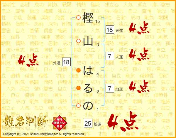 樫山はるのさんの総運は25画の4点!