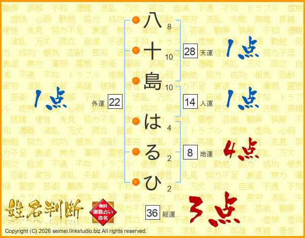 八(8画)十(10画)島(10画) は(4画)る(2画)ひ(2画)