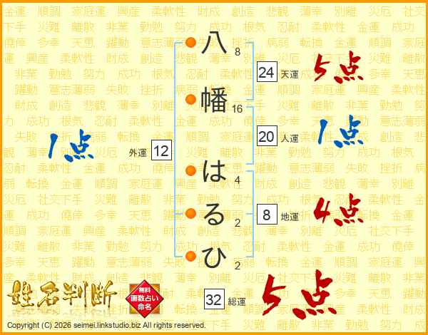 八(8画)幡(16画) は(4画)る(2画)ひ(2画)