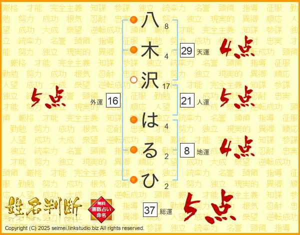 八(8画)木(4画)沢(17画) は(4画)る(2画)ひ(2画)