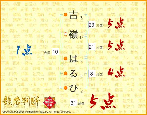 吉(6画)嶺(17画) は(4画)る(2画)ひ(2画)