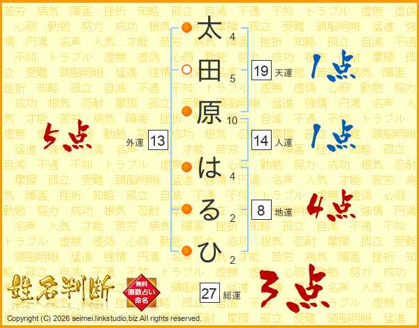 太(4画)田(5画)原(10画) は(4画)る(2画)ひ(2画)
