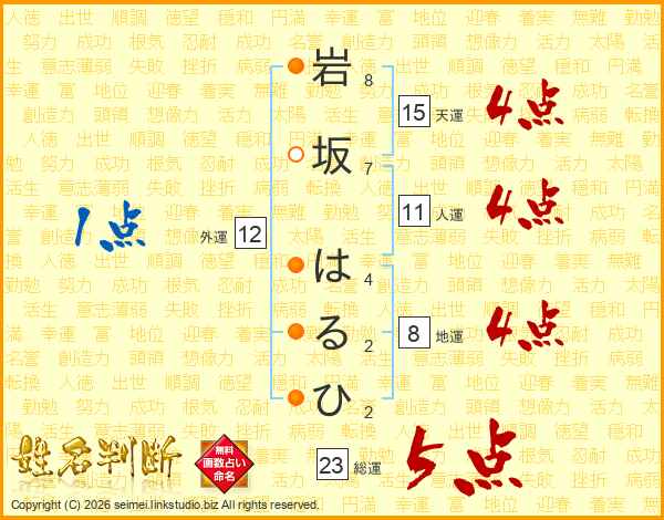 岩(8画)坂(7画) は(4画)る(2画)ひ(2画)