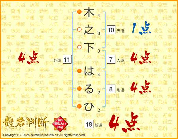 木(4画)之(3画)下(3画) は(4画)る(2画)ひ(2画)