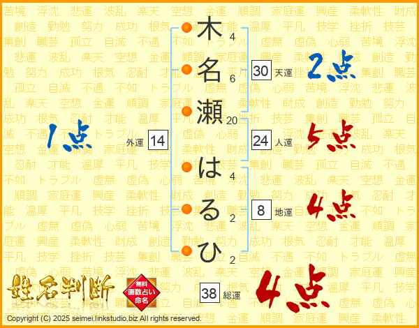 木(4画)名(6画)瀬(20画) は(4画)る(2画)ひ(2画)