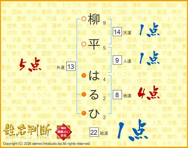 柳平はるひさんの総運は22画の1点!