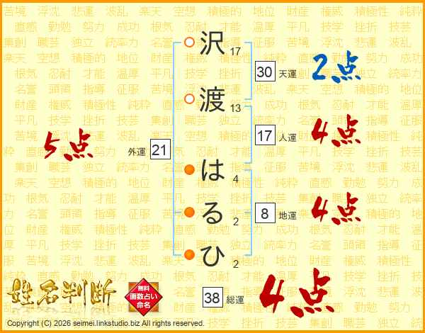 沢(17画)渡(13画) は(4画)る(2画)ひ(2画)