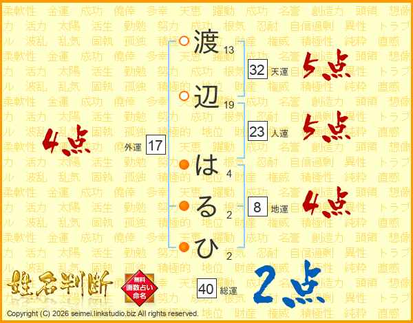 渡(13画)辺(19画) は(4画)る(2画)ひ(2画)