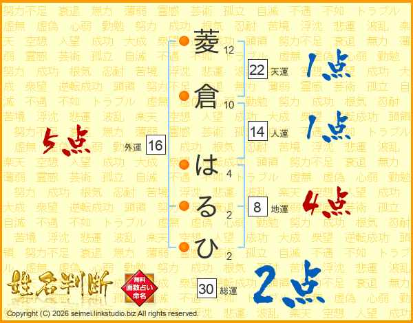 菱(12画)倉(10画) は(4画)る(2画)ひ(2画)