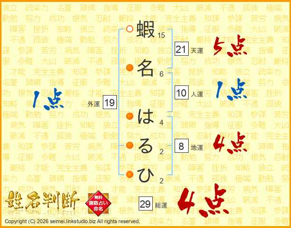 蝦(15画)名(6画) は(4画)る(2画)ひ(2画)