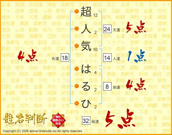 超(12画)人(2画)気(10画) は(4画)る(2画)ひ(2画)