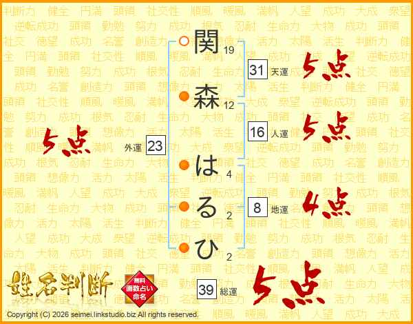 関森はるひさんの総運は39画の5点!