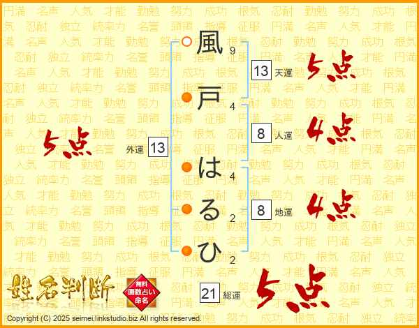 風(9画)戸(4画) は(4画)る(2画)ひ(2画)