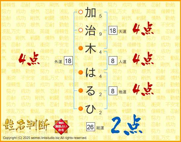 加(5画)治(9画)木(4画) は(4画)る(2画)ひ(2画)