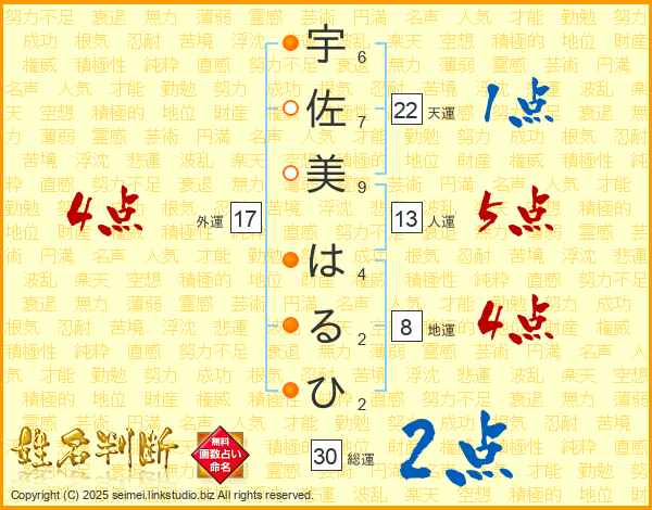 宇(6画)佐(7画)美(9画) は(4画)る(2画)ひ(2画)